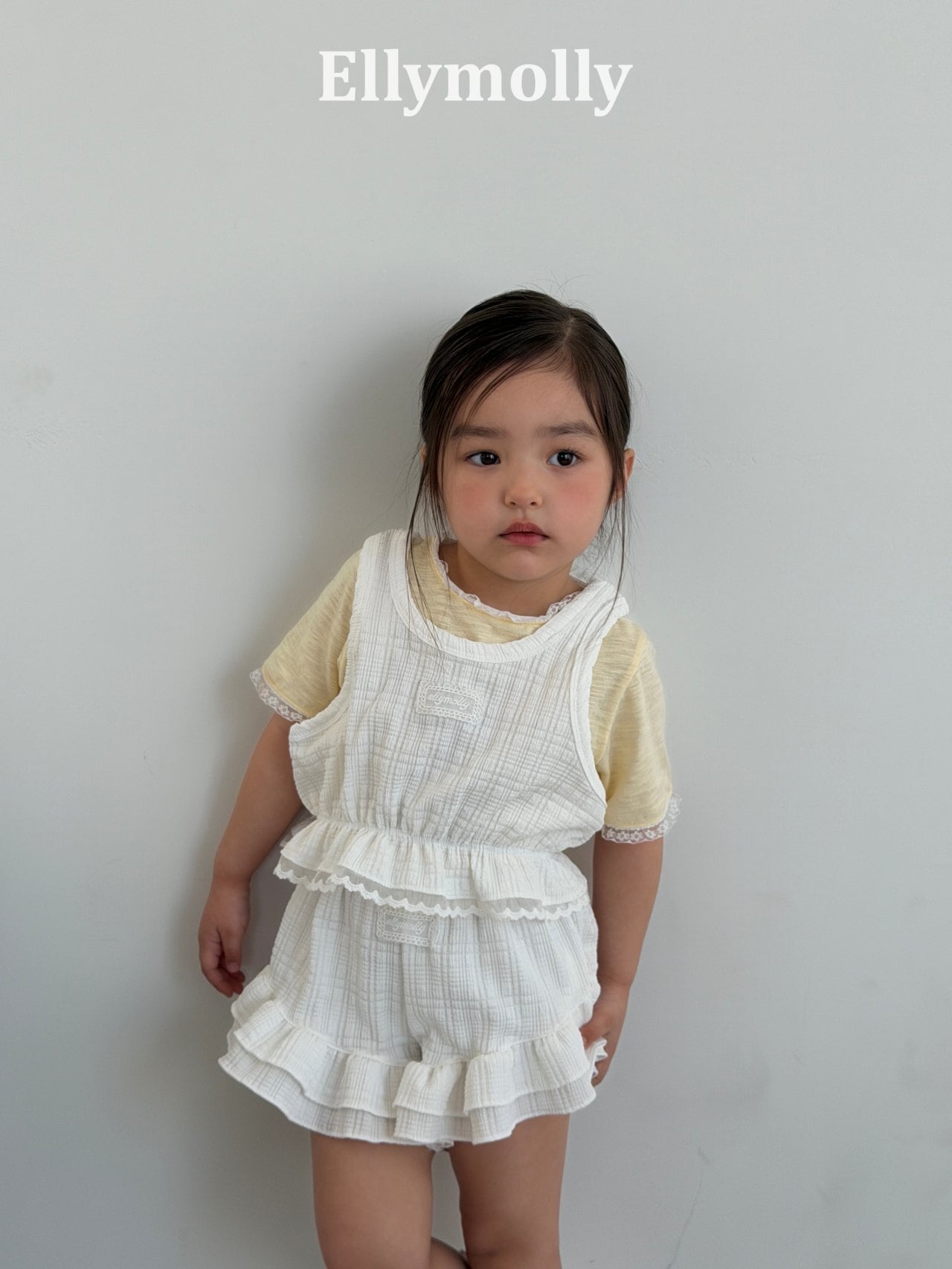 elly molly エリーモリー 韓国子供服 ビスチェ キャミソール フリル 子供服 こどもふく 女の子 26夏 夏 コーデ おしゃれ キッズ ファッション 85 90 100 110 120 130 140 150 160 兄弟姉妹 リンクコーデ 発表会 お出かけ おしゃれ着 かわいい 韓国子供服 レース襟 ロゴグラフィック Tシャツ | 半袖 カットソー 女の子 キッズ服 春 夏 カジュアル ガーリー エリーモリー Ellymolly 80-130cm リブニット ペプラムトップス