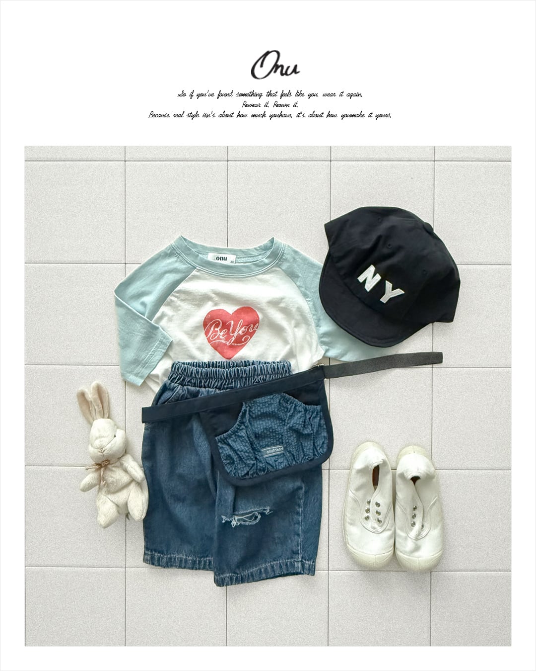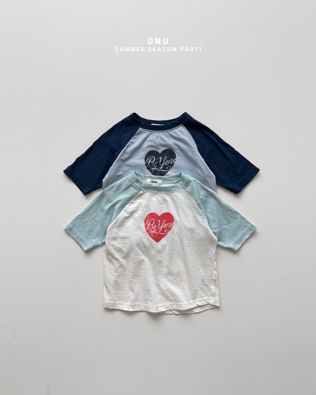 韓国子供服, ONU, オヌ, ボーダーTシャツ, キッズトップス, 半袖カットソー, くすみカラー, ユニセックス子供服, ナチュラルキッズファッション, 春夏新作, リンクコーデ, 男の子服, 女の子服 ハートTシャツ ラグランTシャツ