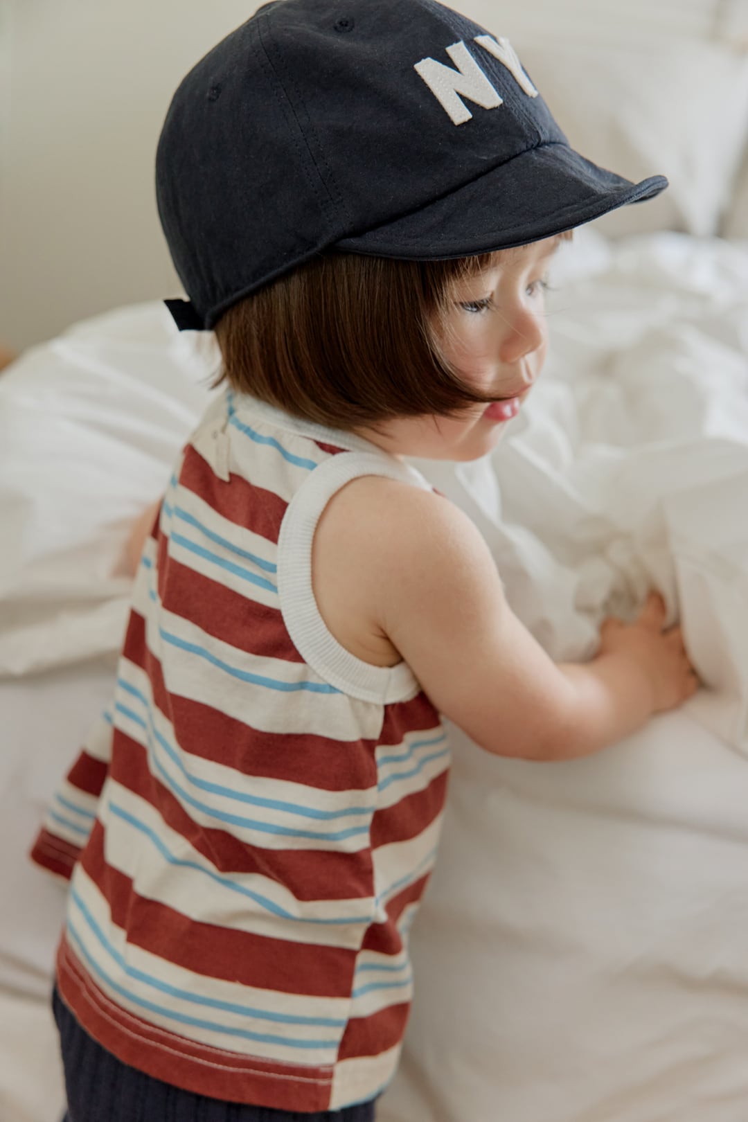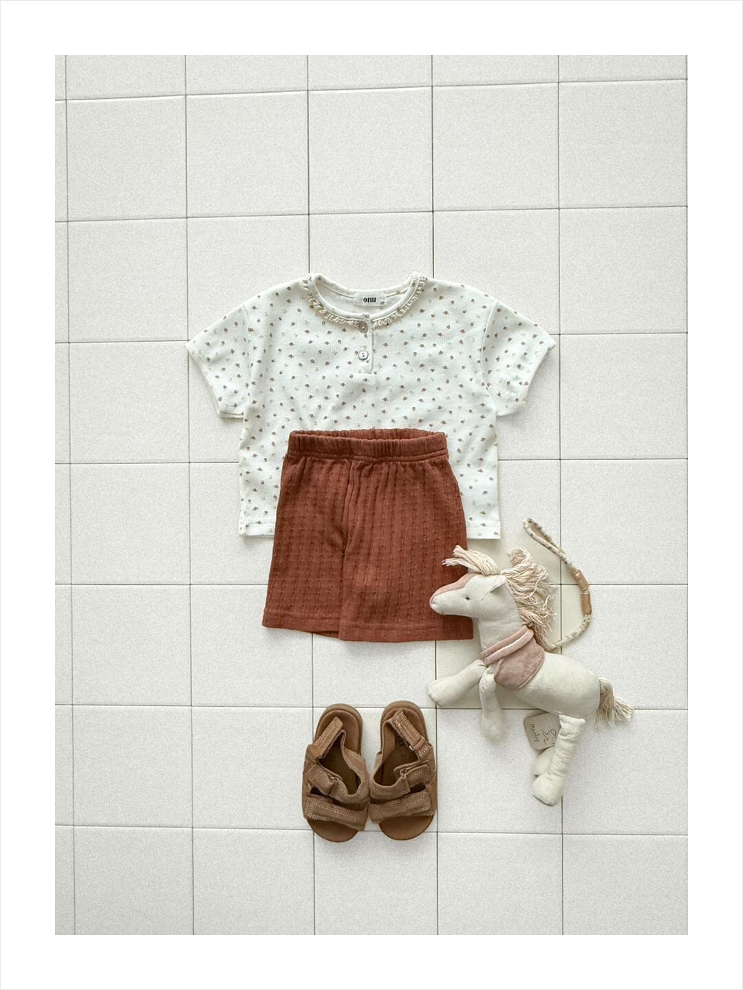 韓国子供服, ONU, オヌ, ボーダーTシャツ, キッズトップス, 半袖カットソー, くすみカラー, ユニセックス子供服, ナチュラルキッズファッション, 春夏新作, リンクコーデ, 男の子服, 女の子服 ジャガードパンツ ショートパンツ