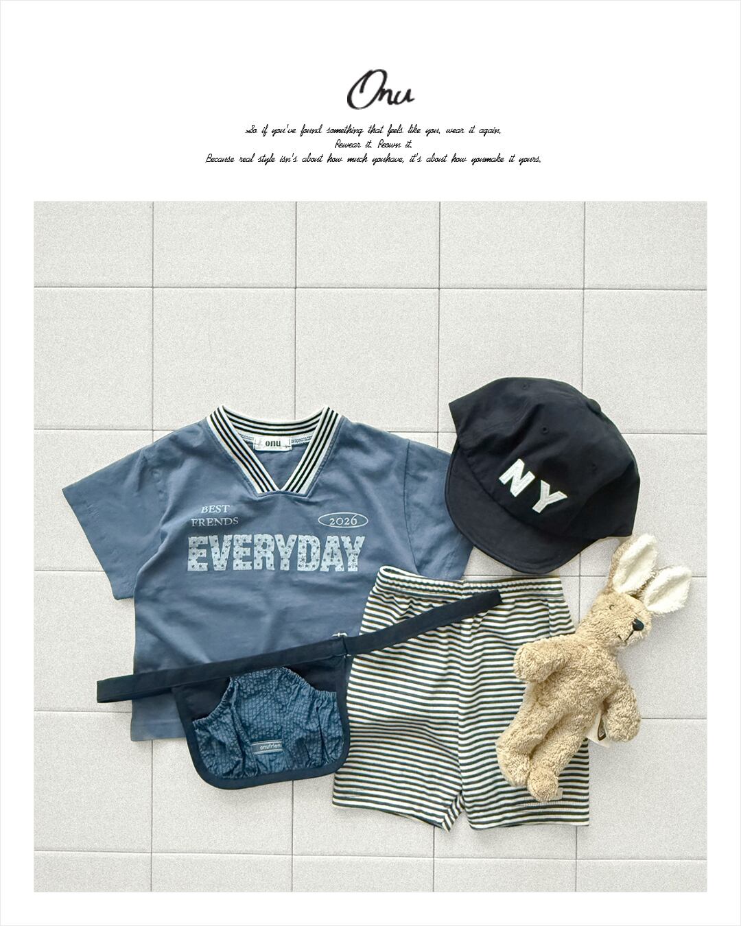 韓国子供服, ONU, オヌ, ボーダーTシャツ, キッズトップス, 半袖カットソー, くすみカラー, ユニセックス子供服, ナチュラルキッズファッション, 春夏新作, リンクコーデ, 男の子服, 女の子服