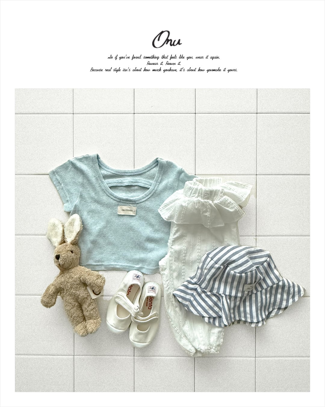 韓国子供服, ONU, オヌ, ボーダーTシャツ, キッズトップス, 半袖カットソー, くすみカラー, ユニセックス子供服, ナチュラルキッズファッション, 春夏新作, リンクコーデ, 男の子服, 女の子服